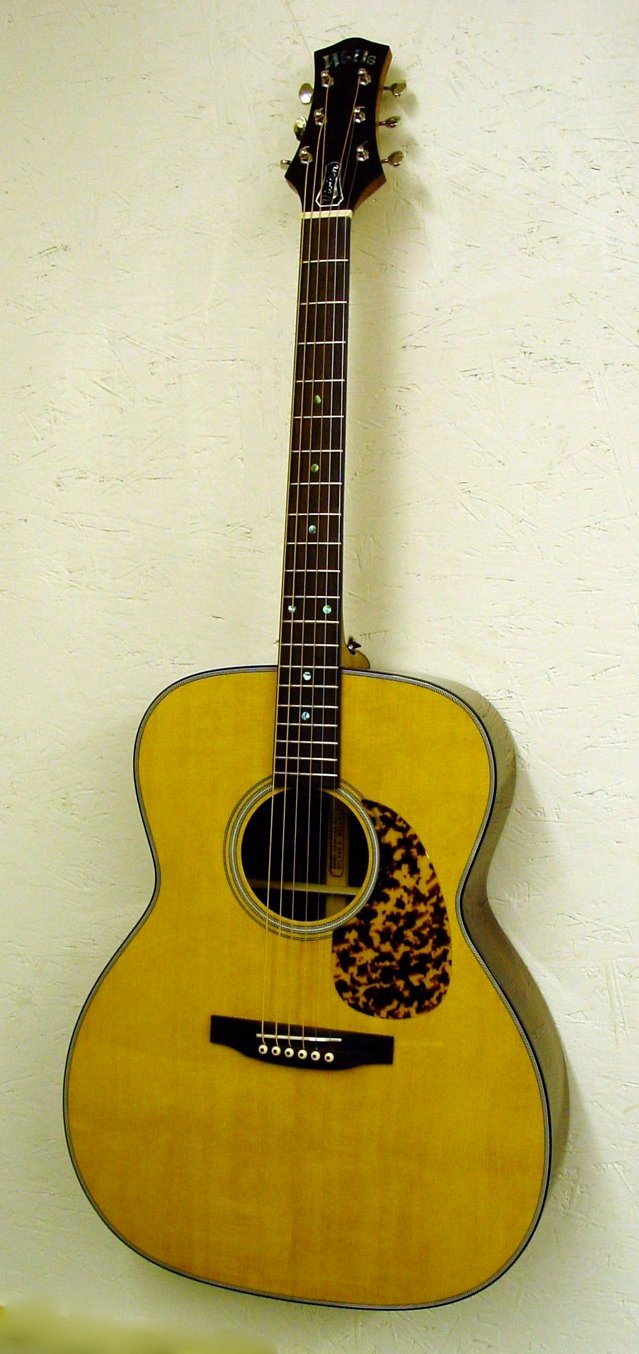 This guitar was built for a very good player in Los Angeles. It is a non cutaway Mediterranean model with Indian rosewood back and sides and a very nice, figured sitka spruce top. The binding and pickguard are tortoise shell. The logo and fingerboard dots are abalone. Although it is not a real fancy instrument, it is framed by a simple request form the buyer: he wanted his daughter’s name on the guitar somewhere. The hard part of this instrument was coming up with the fulfillment of that request in a tasteful manner. You can see the results below. I think the result is stunning.