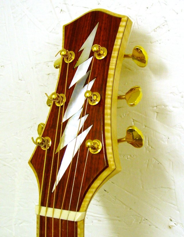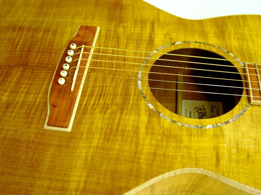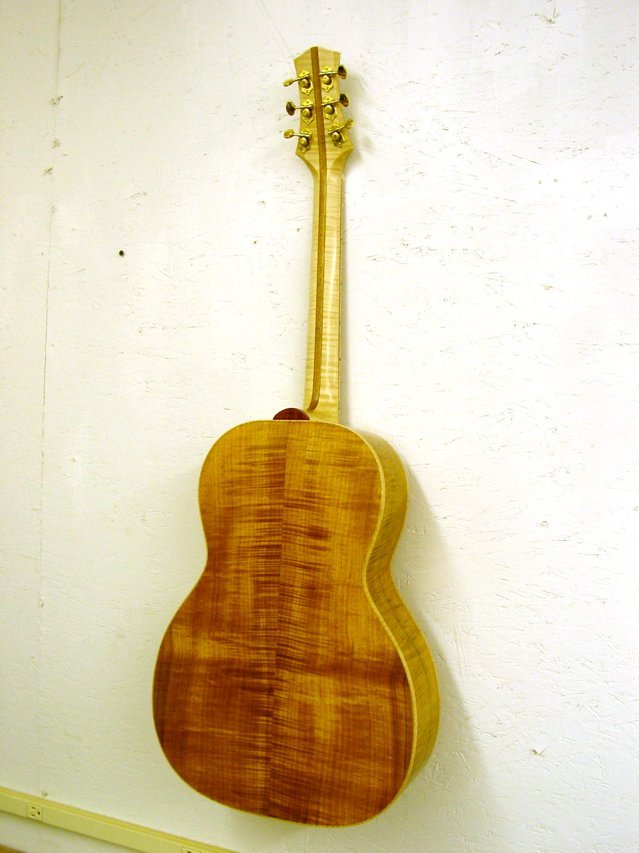 This guitar was built at the Wells Workshop by one of my students, John Coleman. John wanted to try some very different things on his instrument and I thought they turned out so well I wanted to share it with everyone. Initially, the guitar is all koa. top, back and sides. The fretboard and bridge are padouk. This is significant in one respect, padouk is very, very light. The bridge, without the maple underlay only weighed 14 grams (as opposed to ebony at about 36 grams). The guitar is a 13 fret to the body, 25.4″ scale. The neck is maple with a sapele center lamination. The headstock has a maple underlay just like the bridge and exposed in a very different way. Instead of inlaying the maple strip it is exposed by beveling the edge of the headstock. The bridge underlay completes the design for a very unique look. The guitar sounds great with a very crisp treble response.