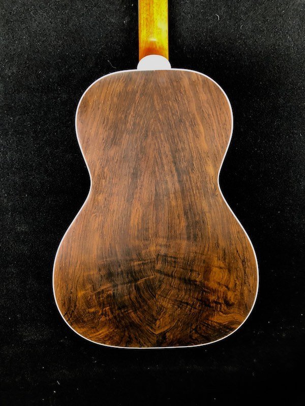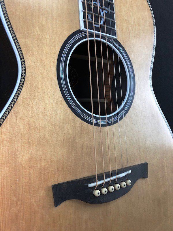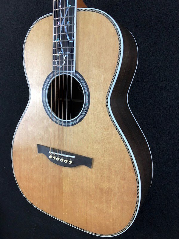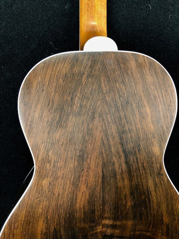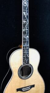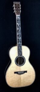 This is a very special 13 fret to the body old growth brazilian rosewood guitar. One of Bay State’s fanciest guitars, it sports an extremely detailed tree of life on the jet black ebony fingerboard.The Bay State Soundring matches the fretboard, both in its’ ebony background and abalone shell inlay. Old style slot head with Grover Sta-tite tuners – just like fifty years ago! Old style herringbone trim is simplistic but beautiful. This guitar looks as if it was made at the turn of the 20th century in its’ workmanship. It also sounds incredible!