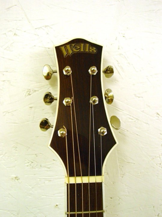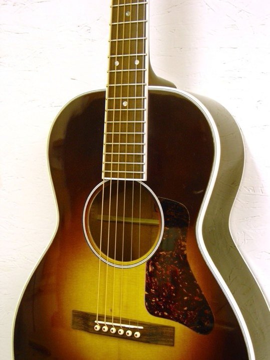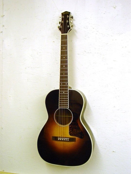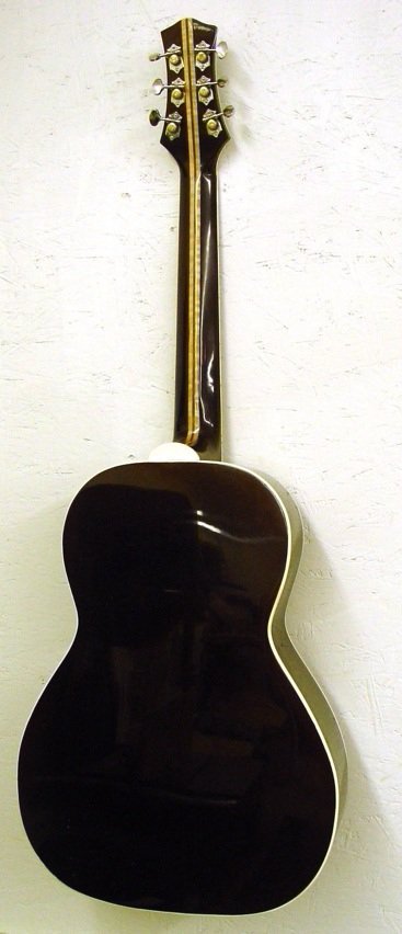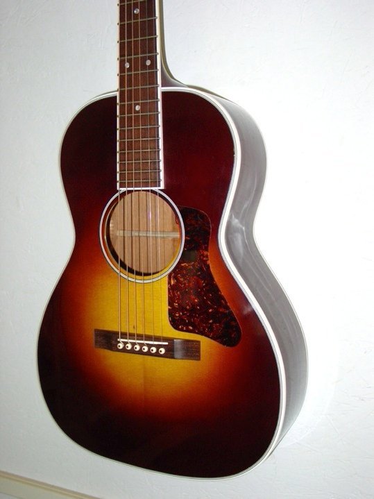 This is the first of the new design of the small bodied, 13 fret guitar. There are a few changes from the prototype, which is also on this web site. Those changes include a slightly different top bracing pattern, and a straight 1 inch bridge as opposed to my regular belly type bridge. As a result of the new bridge style, the weight of this particular brazilian rosewood bridge is down to 16 grams-substantially lighter than any other instrument I have made, which makes the top vibrate more freely and provides a much quicker response. The top is sitka spruce and the back and sides are mahogany. The soundhole is oversized for bass response and overall projection.The peghead overlay, fretboard and bridge are brazilian rosewood. The nitrocellulose lacquer finish is 30’s Gibson style, dark brown with a sunburst top. The pickguard is tortoise cellulose modeled after the small bodied Gibson’s of the ’30’s. The neck is 5 ply (mahogany/maple/rosewood/maple/mahogany) and joins the body at the 13th fret. It has a 25.4″ scale. The fretwork is semi-hemispherical for comfort and extreme playability. As usual on my guitars, the truss rod is hidden from sight but fully adjustable through the soundhole. The neck is wider than normal at 1 13/16 at the nut. The string spacing is 2 5/16″ at the bridge making this an ideal fingerpicking instrument. It is a cannon, rivaling some dreadnaughts in projection and response. Thanks to Dave Fullerton and David Bland for their assistance in getting this guitar finished (only they know what they did)!