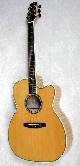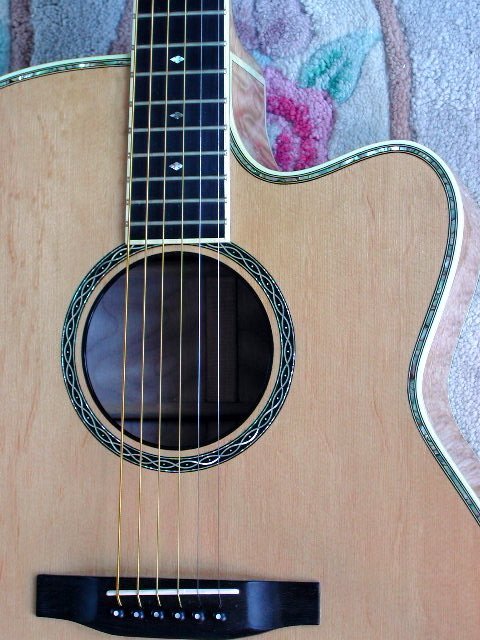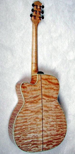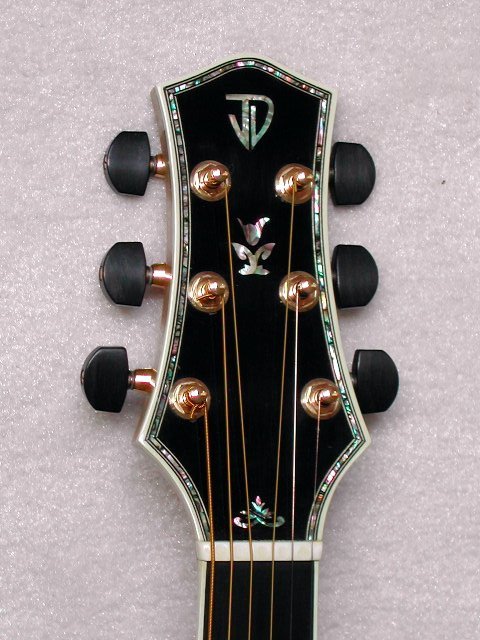 This guitar was built for Jim Dulfer, a collector and very good guitar player in Florida. He specified a very heavily bearclawed sitka spruce top with a very unusual rosette made by Tom Ellis. The back and sides are some of the most beautiful quilted maple I have ever come across. The neck is 5 ply quilted maple. Headstock overlay, fretboard and bridge are ebony. It is heavily ornamented in abalone shell including Jim’s initials on the headstock. A special thanks to Jim Dulfer for taking these photos and allowing me to post them for everyone to enjoy!