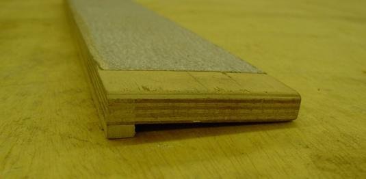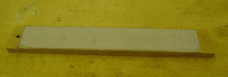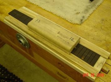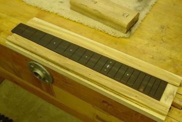This jig is designed to keep the fretboard secure and to center the Stew-Mac radiusing block on the fretboard as you sand. Again, it is a very simple jig. Just a piece of plywood with two thin strips of wood (less than the thickness of the fretboard) glued to the plywood at the same taper as your fretboards. You can use the fretboard as a pattern to glue these strips. Lastly, lay the Stew-Mac Radiusing block centered on the fretboard. Now glue a strip of wood on one side that will track the lay of the radiusing block. Once dry, it provides a straight edge which keeps the radiusing block centered on the fretboard. If you did step one correctly, a couple of minutes with the radiusing block by hand will give you a perfect radius with a minimal amount of work.