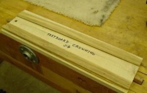 I use two very simple, shop made jigs to crown my fretboards to a 12″ radius. In the beginning I used a Stew-Mac 12″ radius block and lot of elbow grease. That was OK but the primary problem was keeping the radius block centered on the tapered fretboard. Quite a bit of material had to be removed and it was difficult to keep the fretboard from moving. As a result I resolved to try to figure out a way to do this tedious job quickly and precisely.