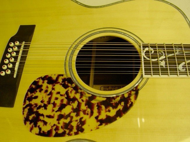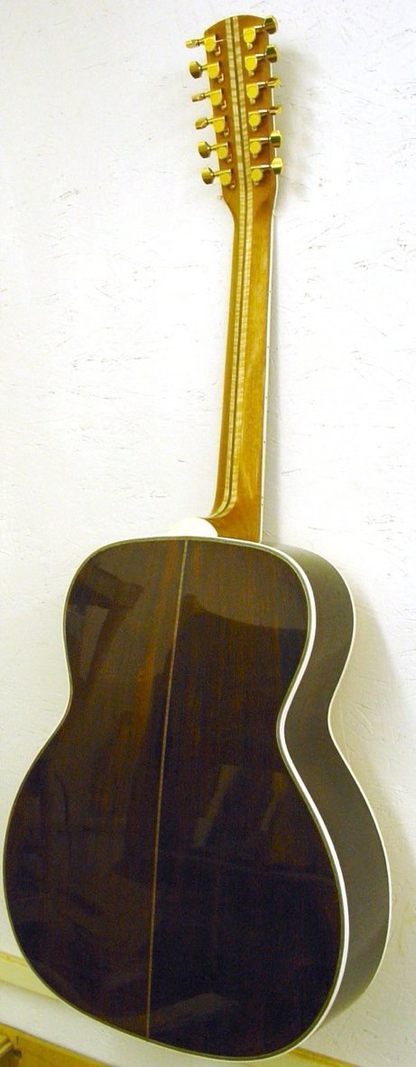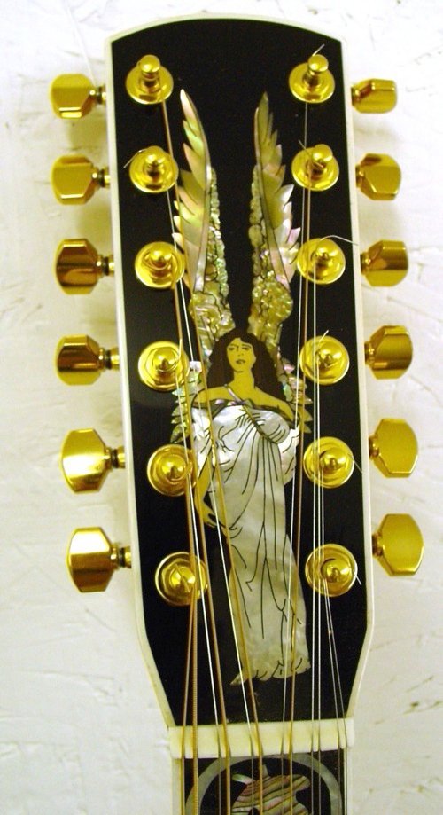 This is an absolutely gorgeous large bodied 12 string guitar! Made with a bearclaw sitka spruce top and straight grained brazilian rosewood, the materials are absolutely the best of the best! The inlaid “Angel” in the ebony headstock defines the intent and purpose of this wonderful guitar. Its’ angelic high treble sound is welcome to the ears. The brazilian rosewood back and sides make the bass tones rich and deep so they are not overwhelmed by the crystal treble response. The headstock overlay, fretboard and bridge are ebony. The “tree of life” inlay is composed of both mother of pearl and the finest solid abalone shell. The neck is 5 ply (mahogany, maple, rosewood, maple, mahogany) for increased stiffness and stability given the extra tension on the 12 string neck. The fretwork is semi-hemispherical for comfort and extreme playability. As usual on my guitars, the truss rod is hidden from sight but fully adjustable through the soundhole. The tuners are gold Gotoh minis. My thanks to Bozo Podunavac for sharing his exquisite bracing pattern for the 12 string guitar! It really did make a huge difference!