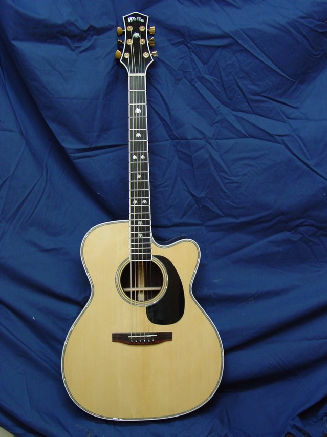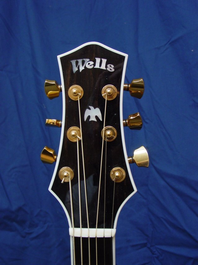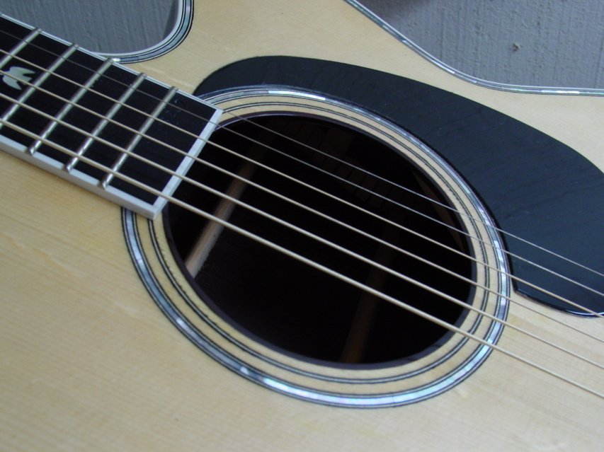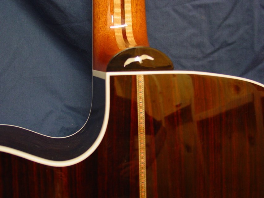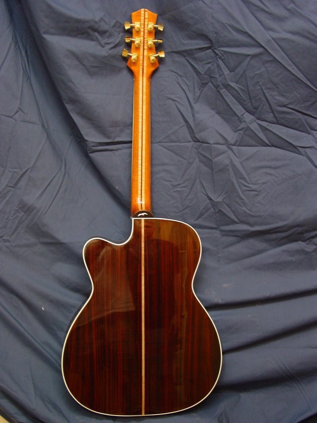 This is a wonderful example of the guitar that I designed to work really well in the recording studio. It was built for a good player in Tempe, Arizona. It has a sitka spruce top and indian rosewood back and sides. The neck is 5 ply mahogany, maple, rosewood, maple, mahogany. the body is quite large-about the overall size of a Dreadnaught but its’ thickness is severly reduced making it quite comfortable to play.