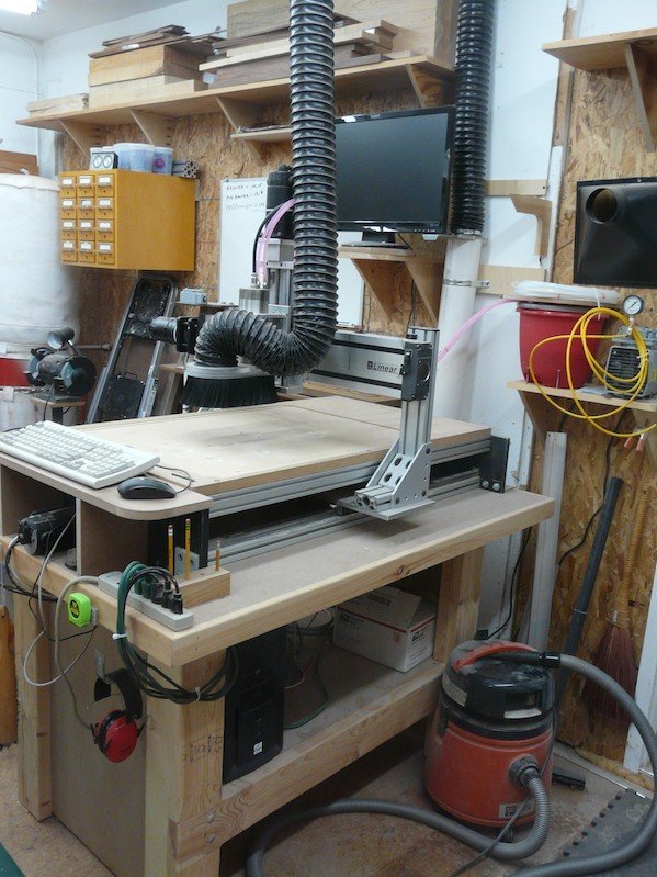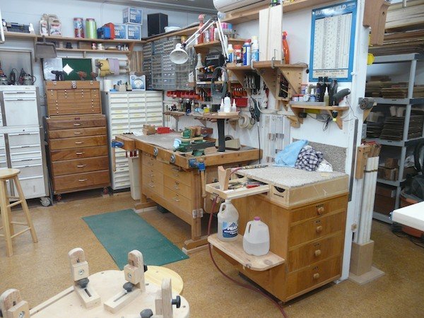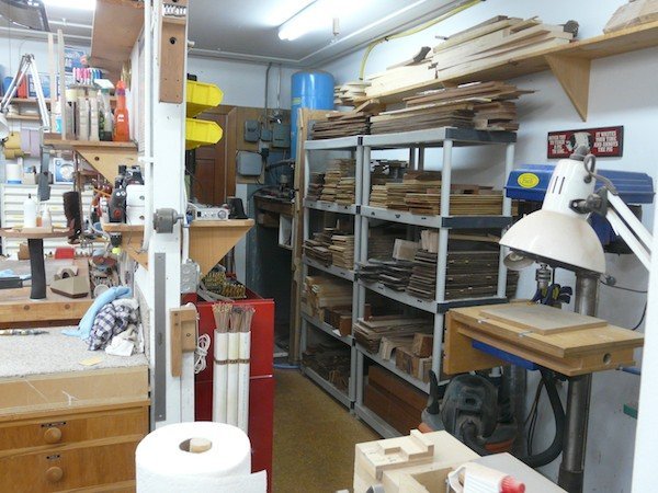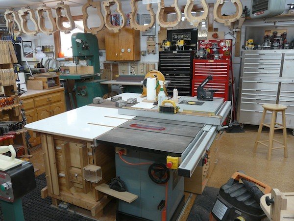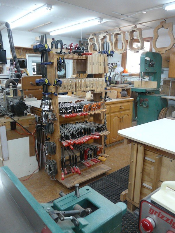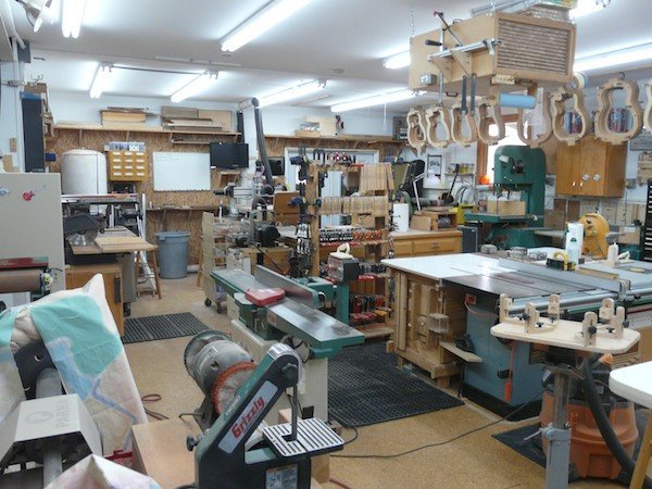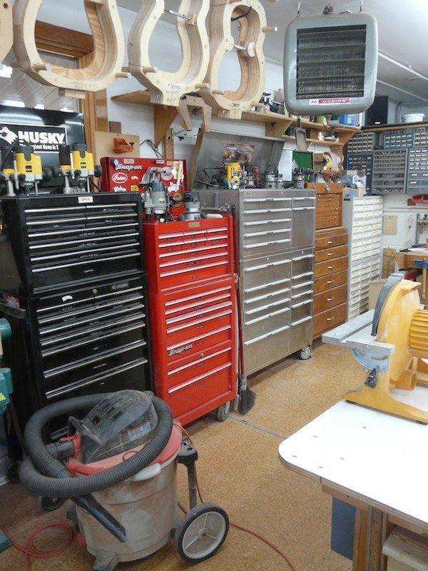 My Shop 2013 Molds! Molds! Molds! | My unique molds which allow the sides to never leave the mold until the back and top are glued on. All wood is date stamped upon receival and not used for at least a year. I want the wood to acclimate to my shop. From the SE corner From the SW Corner From the NW corner | My bender and its’ molds. The main work area | This showcases my two main benches; the smaller of the two only takes up a 4 x4 area. The tablesaw/router station | Most of my work on basic guitar building is done with the table saw. I could not work without it! Clamps! Clamps! Clamps! | What can you say? We need clamps! Multiple Toolboxes | The more toolboxes the better organized you can become. The CNC Machine | This is the newest addition to the workshop. Lots of learning but well worth it!
