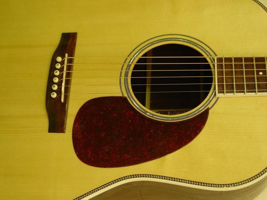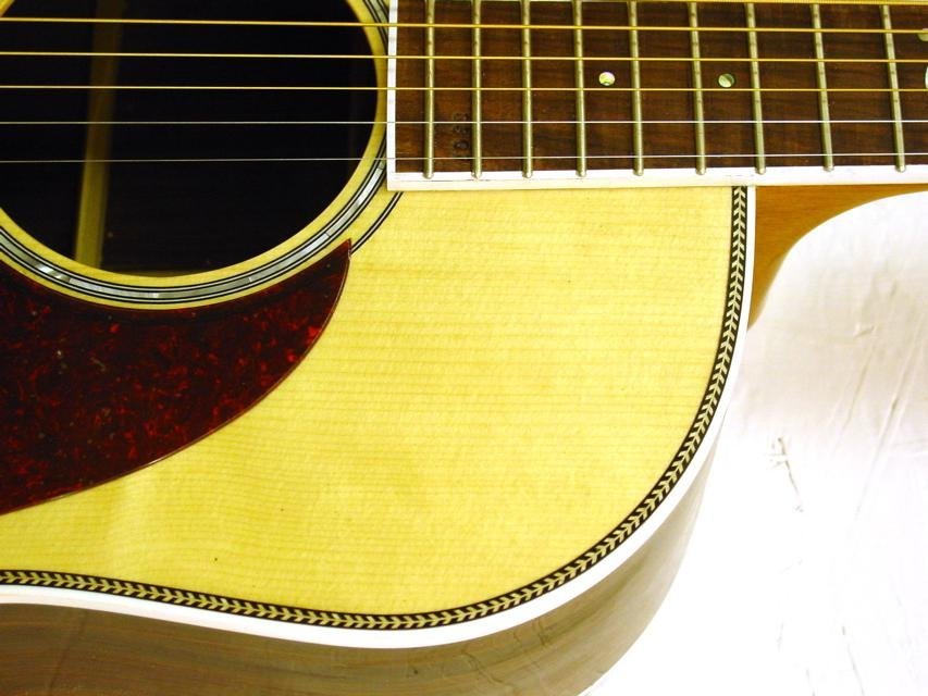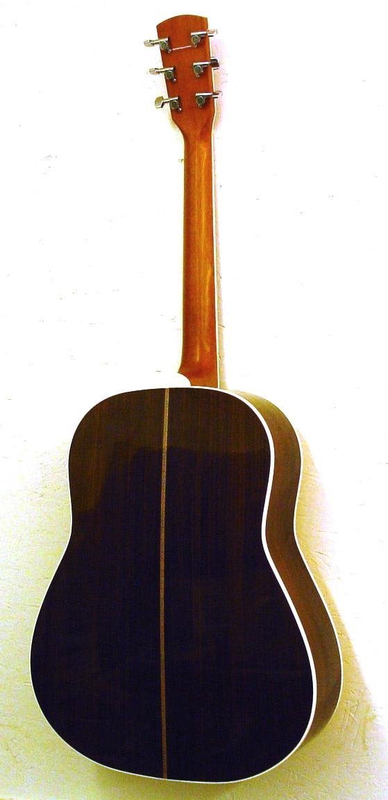 Here is my take on the venerable round shouldered Gibson style guitar. This instrument is made with classic scalloped pre-war bracing patterns for the ultimate in tone and loudness. The bridge, fingerboard and peghead overlay are Brazilian Rosewood. Making the bridge of Brazilian Rosewood cut the weight of the bridge by 33%. This particular bridge only weighs 19.5 grams, making it as unobtrusive as possible on the top vibration. The top is Adirondack Spruce and the back and sides are East Indian Rosewood. Pre-war style herringbone binding and mother of pearl rosette compliment the straight grained top. This entire guitar is extremely light for its’ size which, I believe contributes to its’ terrific sound and responsiveness. The neck is straight grained Honduran Mahogany with a truss rod adjustable from inside the sound hole. The sound hole is oversized, much like Clarence White’s old D-28 which really adds to the bass response of this instrument. Classic Schaller M6 tuners for the ultimate in tuning precision. A terrific instument for a discerning player.