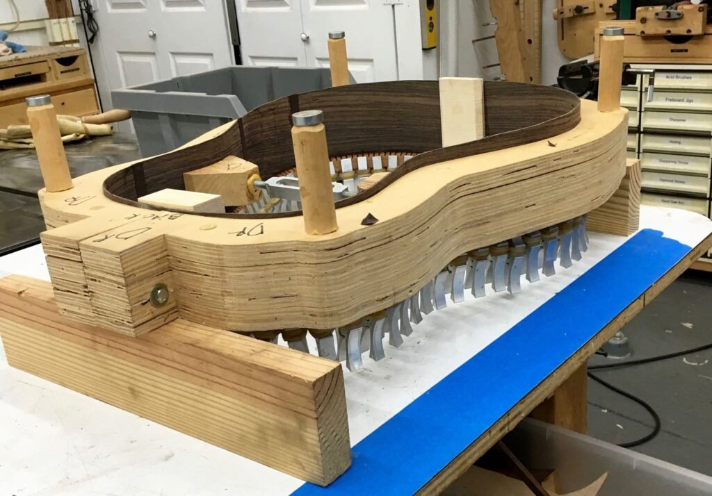 When gluing the lings in the rim it is always difficult to clean up the excess glue so, when it dries, it is not visible in the guitar. Rags, sticks, and other paraphernalia have been used to accomplish this feat. However, the best method I have found to insure the clean glue-up is about the simplest way to do it, i.e., simply flip the guitar body upside down. Then, any excess glue will, with the assist of gravity, recede behind the lings rather spill out. Here is a photo in my shop of doing exactly that. Turning it upside down also makes it much easier to do any minor cleanup!