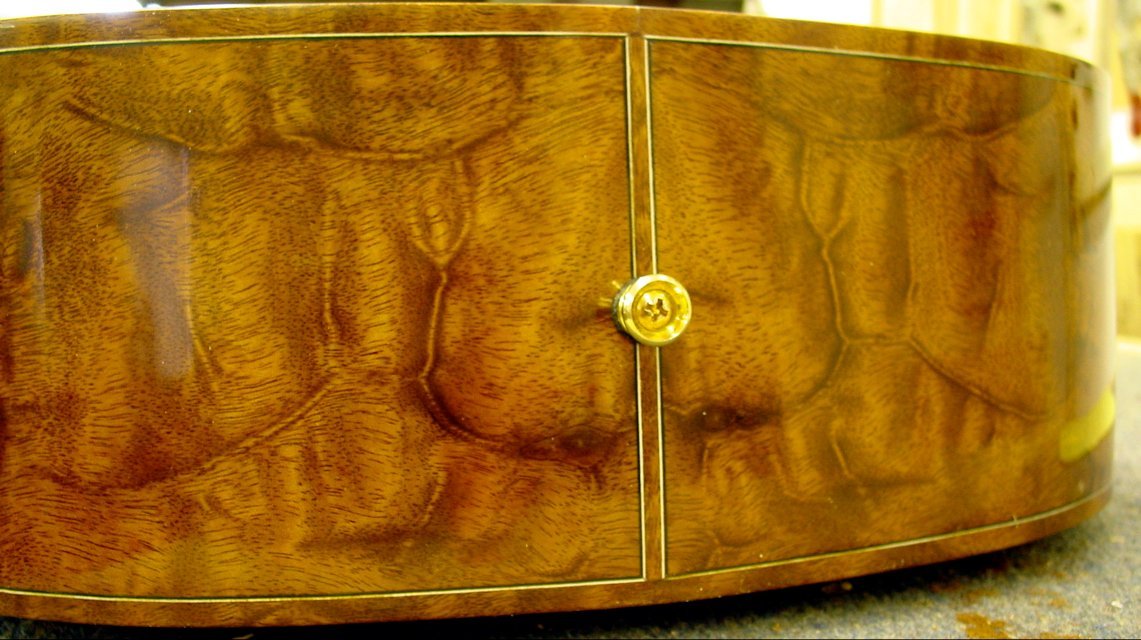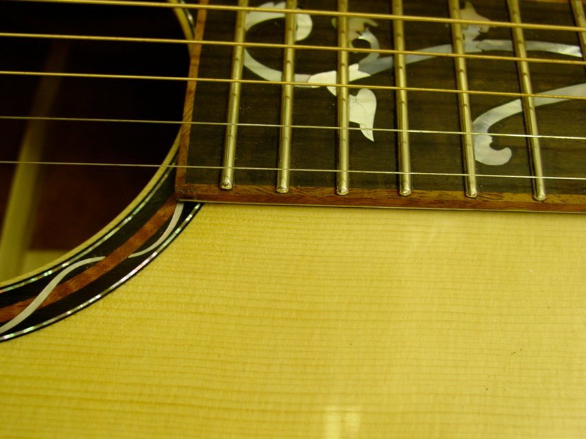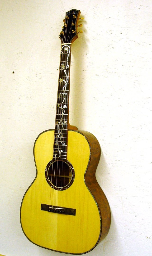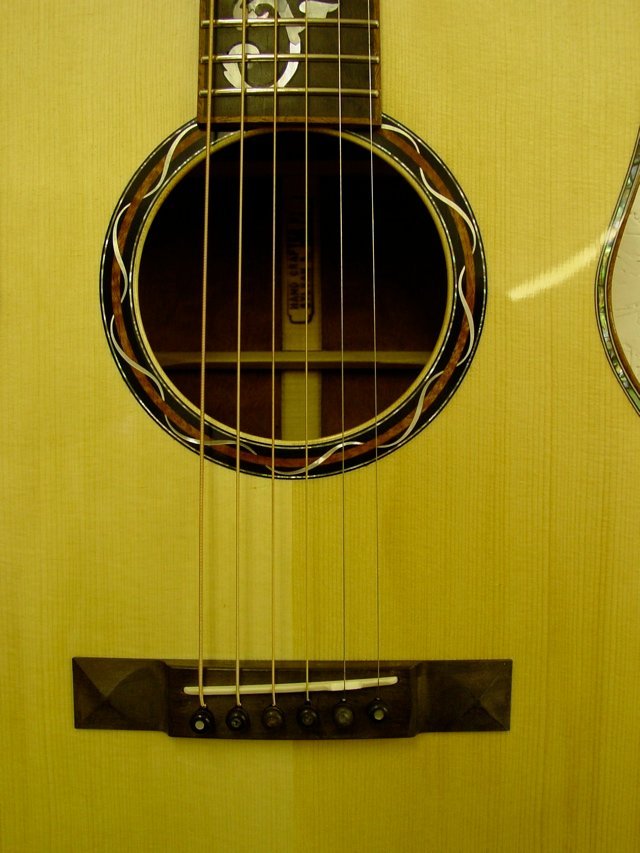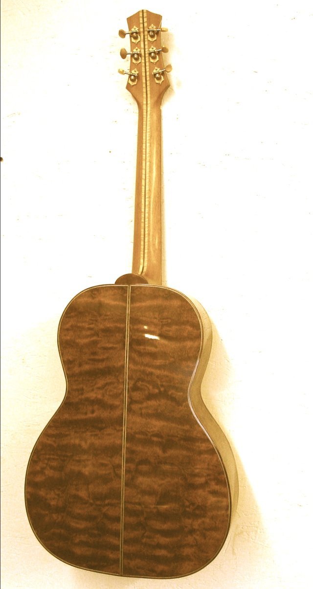 This guitar was just finished on February 1, 2006. It is constructed of extremely good materials including back and side wood which was featured in a 1985 article in FineWoodworking magazine. The back and sides are quilted or “turtle shell” mahogany of which there has only been one tree found to exist. The top is Red Spruce, the pyramid bridge and fretboard, ebony. The binding on the headstock, fretboard, and body are quilted mahogany. All purfling is mitred (back and sides). The outrageous rosette was created by Tom Ellis and features a matching mahogany insert. This is a 13 fret to the body guitar with an enlarged soundhole. It has a “long” scale and 21 total frets. The design pushes the soundhole back to the center of the guitar creating an extremely loud and “punchy” sound. The tuners are Waverly’s executed in a brushed gold which is no longer available. It is 1 3/4″ at the nut with 2 5/16″ spacing at the bridge making this instrument an ideal fingerpicking guitar. The finish is nitrocellulose lacquer, gloss on the body and semi-gloss on the neck for better playability.