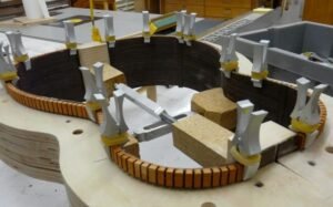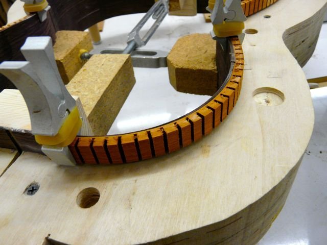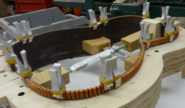The most consistent way to install these linings (even on hard to do cutaways) without breaking is to wet the linings with water and then clamp then around the sides on the outside of your mold positioning them in exactly the same way as if you were gluing the linings on the sides themselves. Clamping them first with this method provides backing for the ultra thin backing material to bend in exactly the way you want without breaking. |