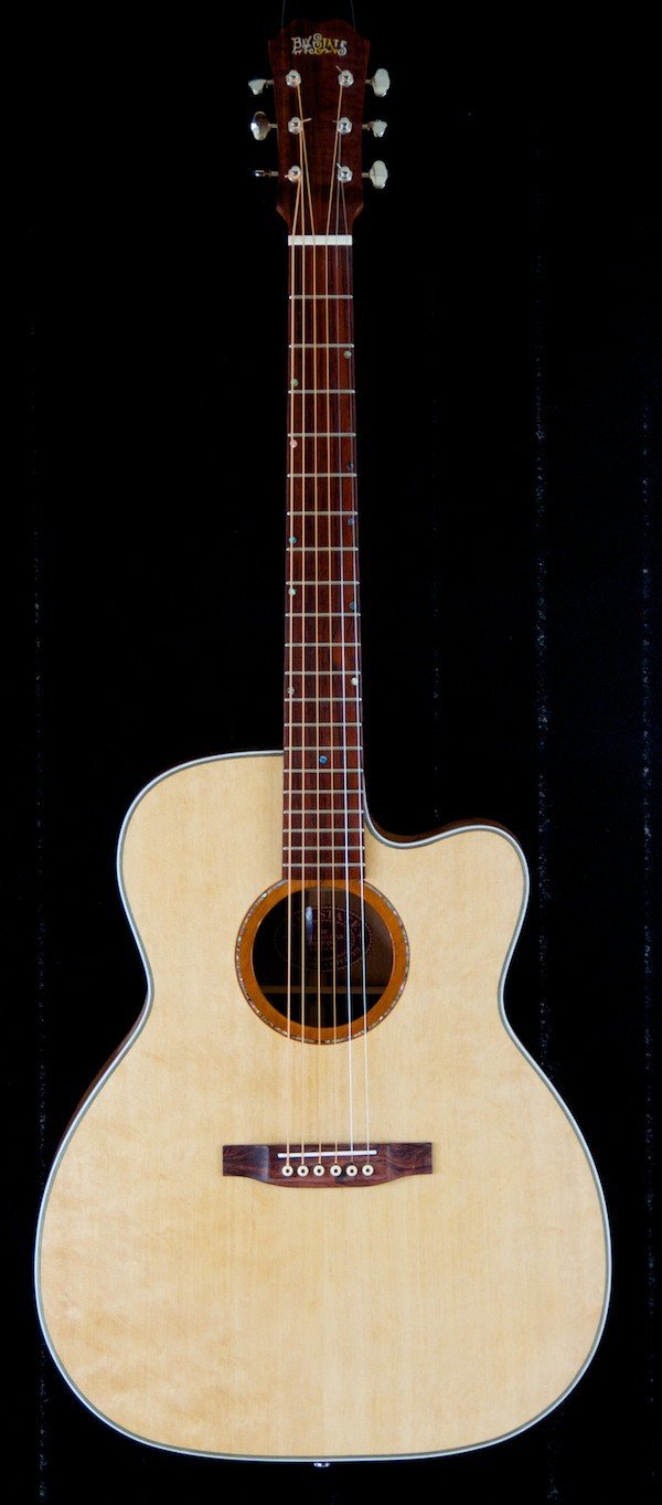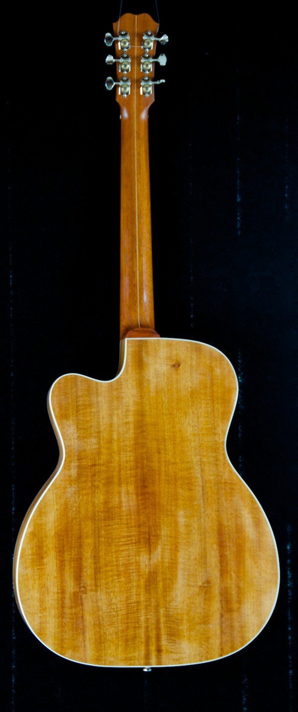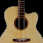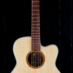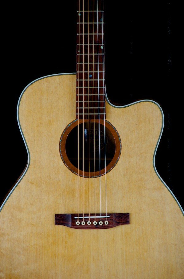 This Somerville has Koa back and sides with an extreme “bearclaw” Sitka top. The BayState® Soundring Rosette matches the Madagascar Rosewood fretboard with the proprietary Bay State dots. The neck is Mahogany with a thin maple divider. The bridge and headstock are Brazilian Rosewood. All in all, a terrific combination! And it sound great too – right out of the box!