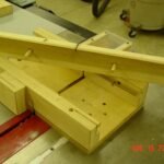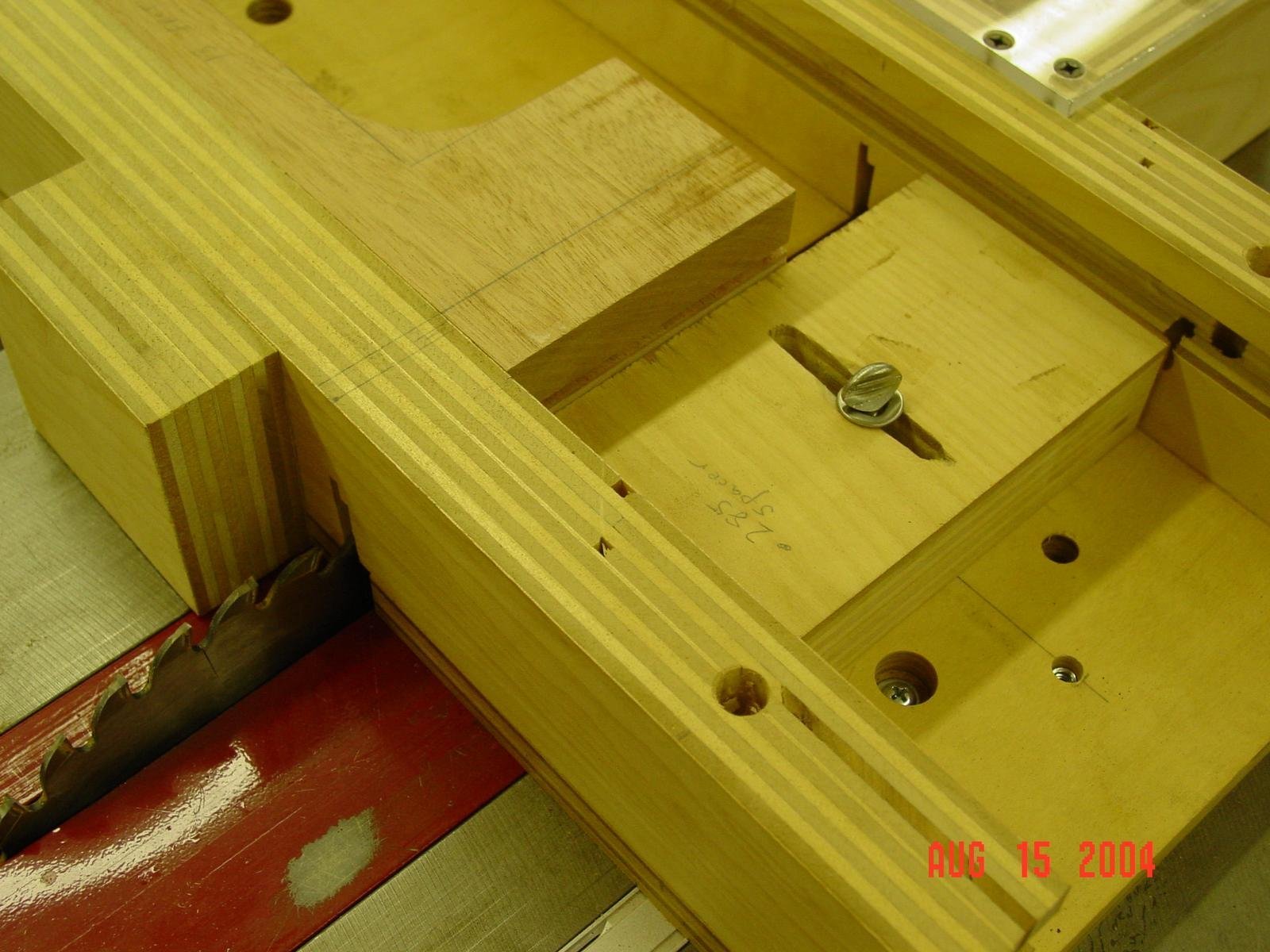 The sled is nothing more than a platform made out of plywood with a miter slide that keeps the platform square to the table saw blade. In order to use the sled to cut the tenons on the neck it is necessary to remove the back portion of the sled with the fret pin in it. It is attached to the sled with two dowels. I just remove it.