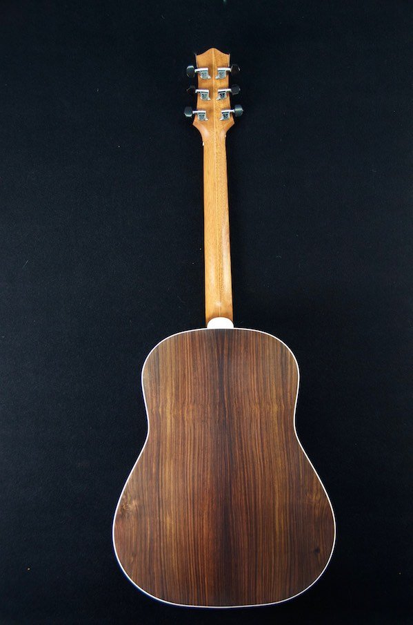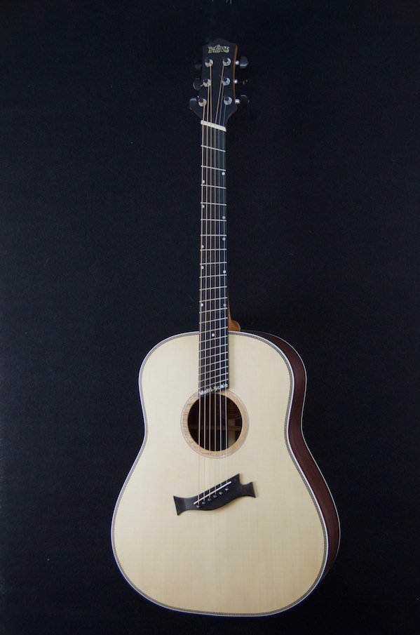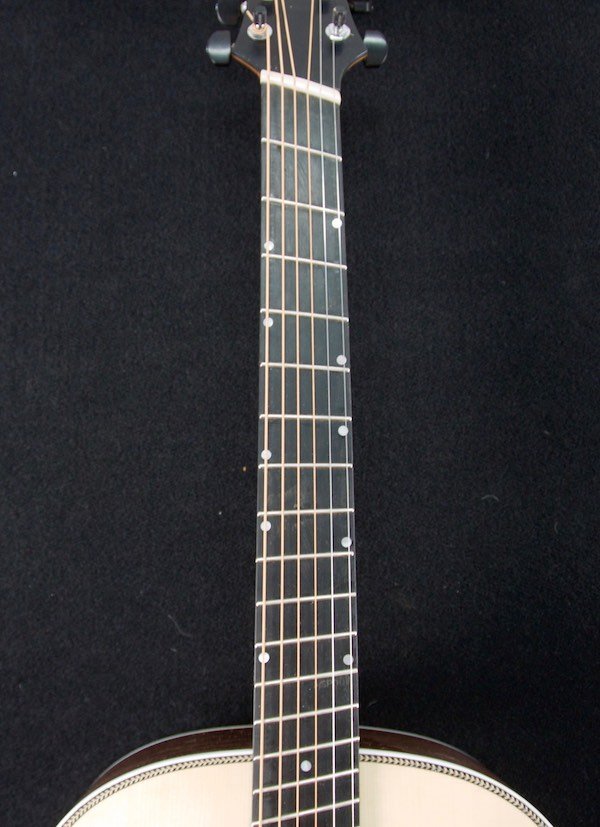 This particular instrument was built of Adirondack Spruce and Indian Rosewood. Ebony faceplate, fingerboard and bridge. Soundring rosette leaving no end grain (of the spruce top) exposed. Schaller front-locking tuners.