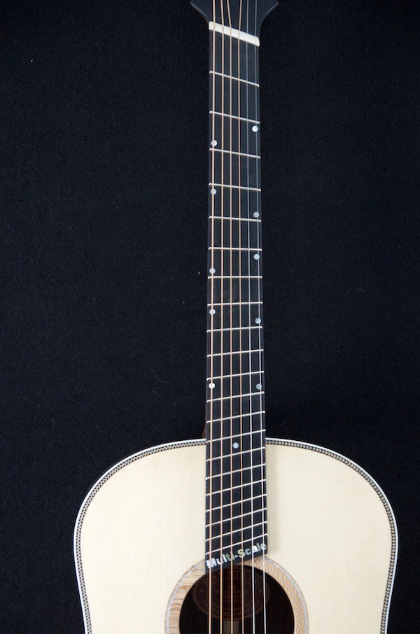 The Bay State Multi-Scale instrument is designed differently than a standard guitar in much the same way as a Grand Piano is to an upright piano. That is, on a regular guitar and an upright piano all of the strings, both bass and treble are the same length. A Grand Piano and this instrument are designed so that each string is a different length, i.e., the bass strings are much longer than the treble strings. This makes for much better bass response and crisper trebles just like the piano example. It also seems to have much better intonation and tunes better than a standard guitar probably because each string is a different scale length.