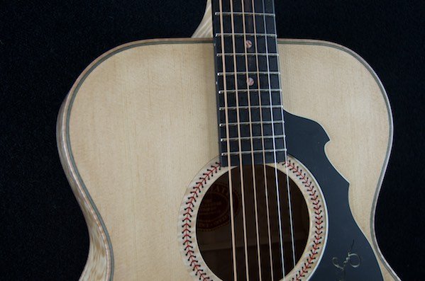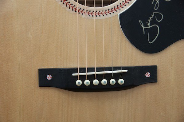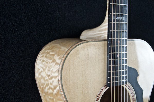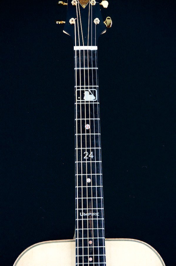 The round dots on the fretboard and bridge became baseballs. The stitching on the baseball inlays is actually etched into the baseballs. And, of course, the Umpire’s major league baseball symbol resides at the third fret.