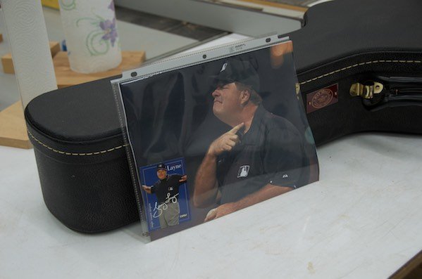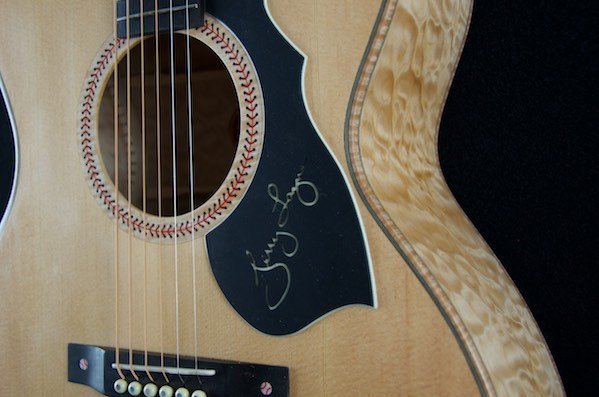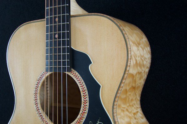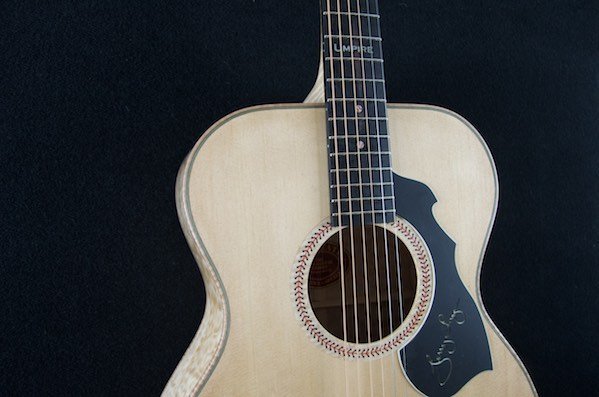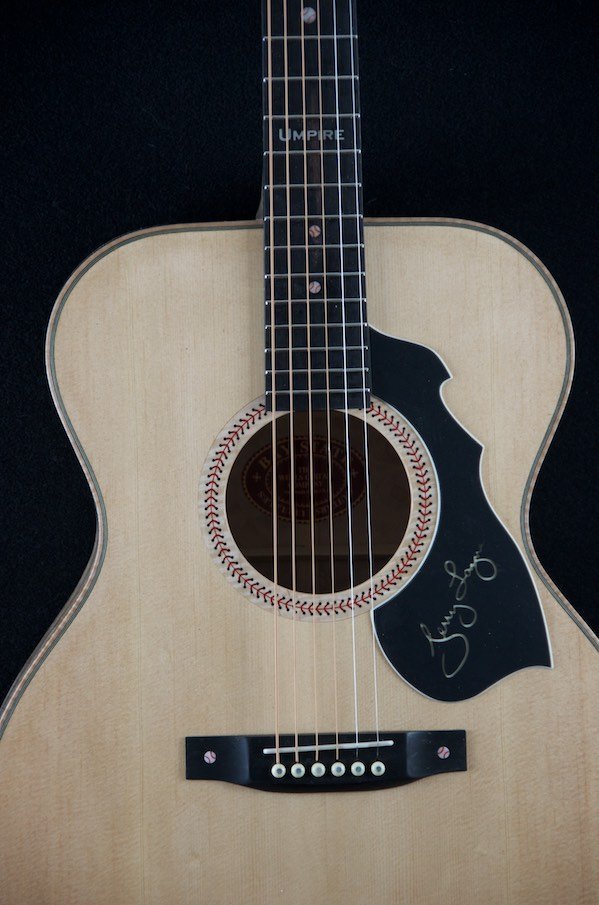 Jerry Layne is a long time Major League baseball umpire and crew chief. He asked if I would build him a guitar to commemorate his time in the Major League. He wanted it to be highly personalized with at least his signature and his Major League number. Other than those two requirements he left the art wide open to truly make a “baseball” work of art.
