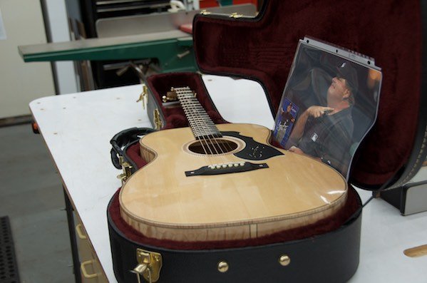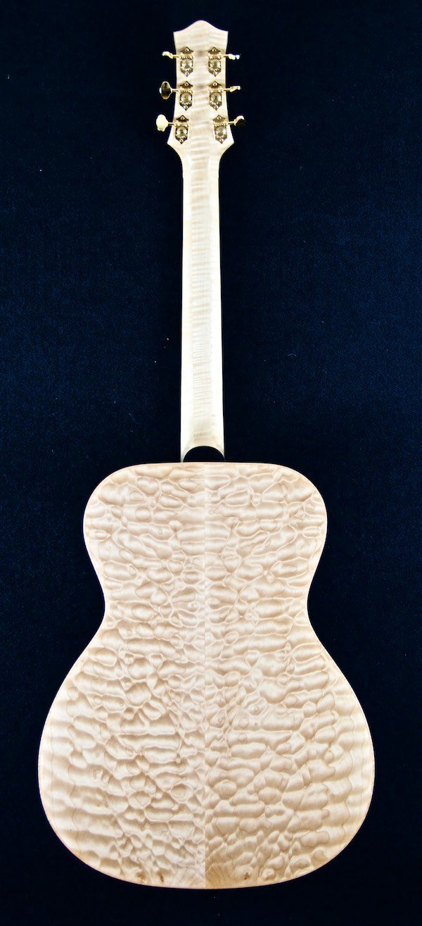 The guitar itself is made of stunning quilted maple for the back and sides. The top is sitka spruce. The headstock overlay, fretboard and bridge are the finest ebony. The neck is heavily flamed maple.