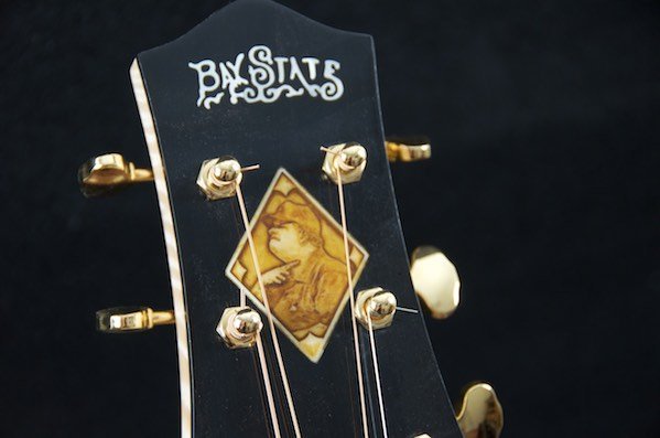 The first original design was to create a rosette that resembled a baseball. The rosette was created and inlaid into a piece of flame maple so it would simulate the leather of a scuffed baseball. The next major task was to create his photograph in material inside a “baseball diamond”. That would then be inlaid into the headstock. Take a look at his photo and the closeup of the headstock.