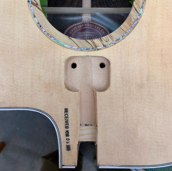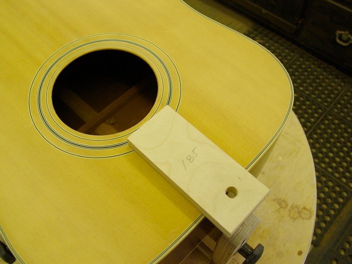 After binding the body and a general cleanup, do a rough set of the neck. Insure the neck is centered on the top. Once the neck is right scribe a line around the outside of the fretboard. From your previous mark, locate the horizontal brace. This locating hole is the end of the rout into the top (soundhole side not shown in the photos).