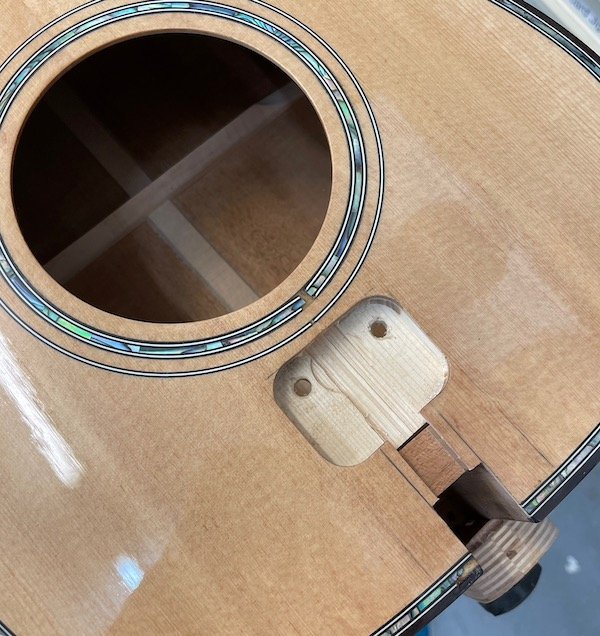 Make the guitar body as you normally would. However, leave your upper transverse brace very beefy along its’ length (Mine are 5/8″ x 1/2″). This brace transmits the stress from the block attempting to rotate and disperses it to the sides of the instrument reducing the need for a neck set in the near future. While building the top, glue a piece (I use spruce but mahogany or baltic birch plywood would suffice) 2 ¾” wide and .425” deep (and with a truss rod slot routed in the piece if your rod is adjusted through the soundhole) from the horizontal brace to the neck block on the centerline of the top as shown below. Once glued to the top drill from the bracing side a locating hole to locate the position of the back (towards the neck) of the horizontal top brace from the top because when the top is glued to the body you can no longer see the horizontal brace’s location. This is important because it defines the end of the rout in the body for the neck.