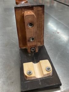 To install the neck, first attach using the two bolts that hold the neck to the body. Then, using 9/16” long 8/32 bolts and washers and lock washers (McMasterCarr.com), attach the fingerboard. Snug down tight but do not overtighten! If, for some reason, the fretboard is not flat to the top, undercut the bottom of the fretboard just like you would undercut the neck joint to get a good fit. Remember, only the outside of the fretboard will be actually touching the top and will be seen.