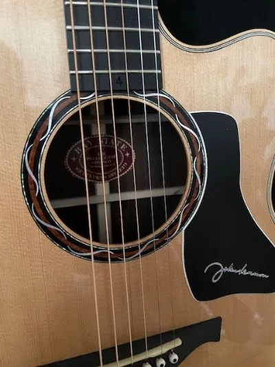 This guitar was built to honor one of the great songwriters and performers of my generation, John Lennon. Made of spruce, ebony and brazilian rosewood, the guitar encompasses John’s caricature in pearl at the 12th fret and his signature on the pickguard. The number 9 was significant to the Beatles but especially John. Tom Ellis built the rosette about 20 years ago and I had saved it for the perfect guitar. The finish is french polish with Gold Grover 18:1 tuners.